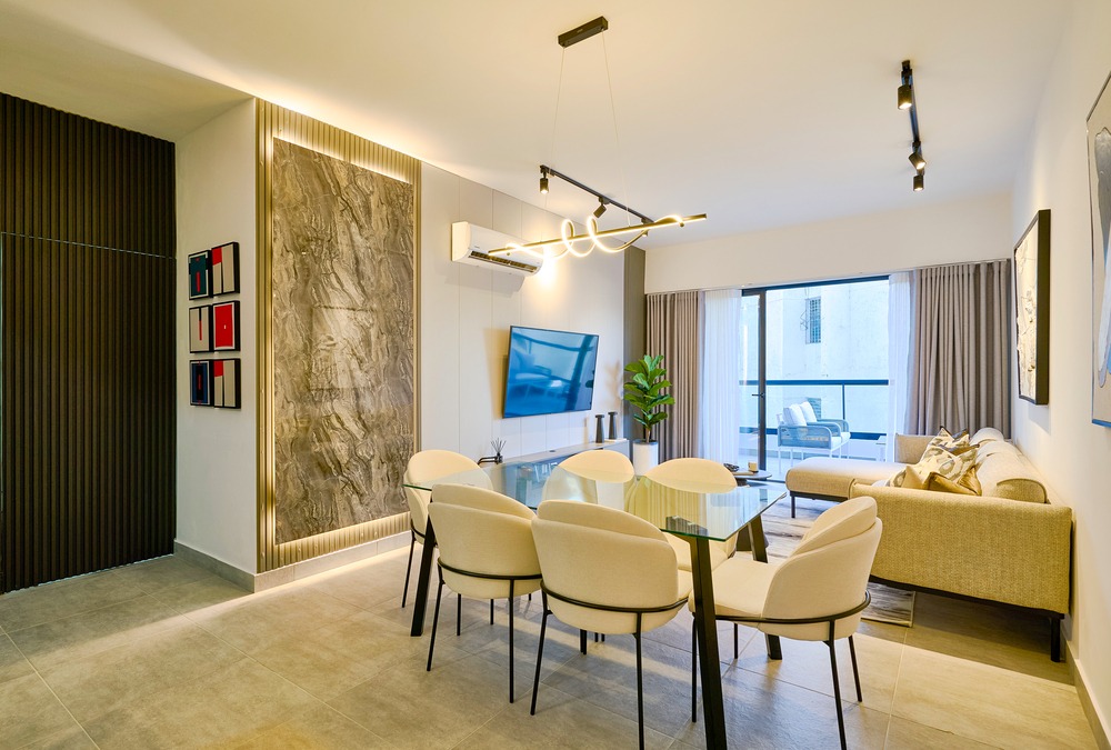 La intervención incluyó la creación de una pared con puerta oculta, aportando continuidad visual y discreción en la distribución. Se utilizaron materiales sobrios y una paleta de blancos, negros y tonos grises, generando un contraste elegante y atemporal. Los paneles decorativos refuerzan la verticalidad y evocan un aire sofisticado, mientras que el equipamiento completo garantiza funcionalidad y confort. El resultado es un espacio contemporáneo, de líneas limpias y estética refinada, ideal para el mercado de alquiler temporal de alto nivel.